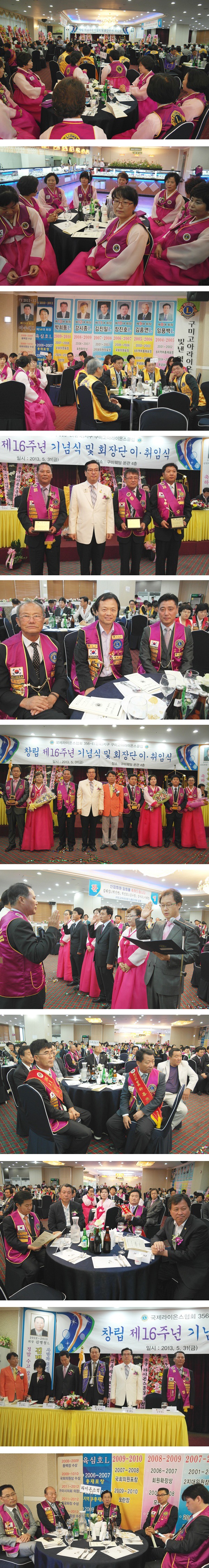 국제라이온스협회 356-E지구 구미고아라이온스클럽 '창립 제 16주년 기념식 및 회장단 이ㆍ취임식'이 5월 31일 구미웨딩에서 개최됐다. 김병철회장의 개회선언 및 타종으로 시작된 행사는 윤리강령낭독, 총재표창 및 치사, 축사, 자매클럽 공로패 증정 등으로 진행되었으며, 역대 회장단 및 자매클럽 회장단, 회원 등 200여명이 참석해 김병철 회장의 노고를 치하하고, 박태명 회장의 취임을 축하했다. 김병철 회장은 이임사에서 "회원 여러분들의 도움 없이는 이 자리에 있을 수 없다"며 "도와주신 회원과 주변분들께 감사드리고, 박태명 회장의 결단력과 추진력이 고아라이온스의 앞날에 빛이 더 할 것으로 생각한다"고 말했다. 박태명 회장은 취임사를 통해 "숭고한 봉사정신으로 열정을 다하신 회원들께 감사드리며 지역사회 발전과 나눔을 실천하는 고아라이온스를 위해 최선을 다 하겠다"고 말했다. 1997년 창립한 고아라이온스는 자연보호 캠페인, 독거노인 백미전달, 불우 이웃 돕기, 소년ㆍ소녀 가장 돕기, 중ㆍ고 장학금 전달과 결식아동 식대 지급 등의 봉사 활동을 꾸준히 이어가고 있다.