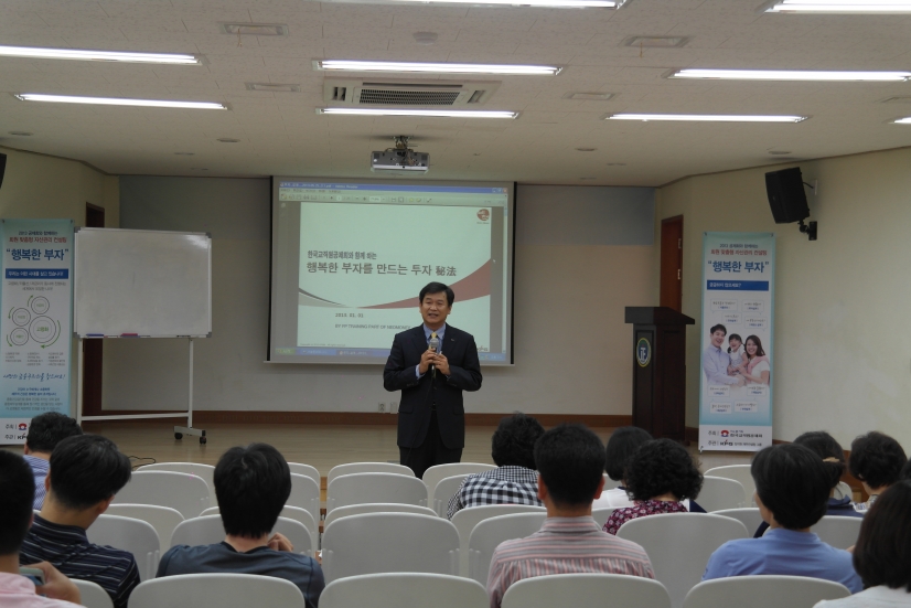 한국 교직원 공제회 주최, KFG(주)임직원 재무컨설팅그룹 주관으로 6월 19일 구미 정수초등학교 시청각실에서 교직원대상 '회원 맞춤형자산관리 컨설팅'을 개최했다. 이번 컨설팅은 금융환경, 사교육비 급증, 가정경제 불안, 퇴직, 육아, 질병, 은퇴후 삶, 내집마련등 행복한 삶을 위한 생애 재무설계 방법으로 재무적 고민으로 부터 해방하기 위해 마련 되었다. 서성준 KFG(주) 부장은 "재무컨설팅은 미래를 계획, 평생 행복을 준비해가는 중요한 전환점이 될것"이라며, 자식에게 무엇을 물려주기보다 당대에 책임질수있도록 해야한다"고 말했다. 김판진 정수초등학교장은 "고령화가 빠른 속도로 진행되고 있는 시대를 우리는 살고 있다"며 "소득과 지출을 잘 관리하여 나만의 재무설계 방법으로 밝은 미래를 준비하자"고 말했다. 한편, 건강이 누구에게나 소중하듯 재무적 건강은 행복한 삶의 초석이 되고 있다.