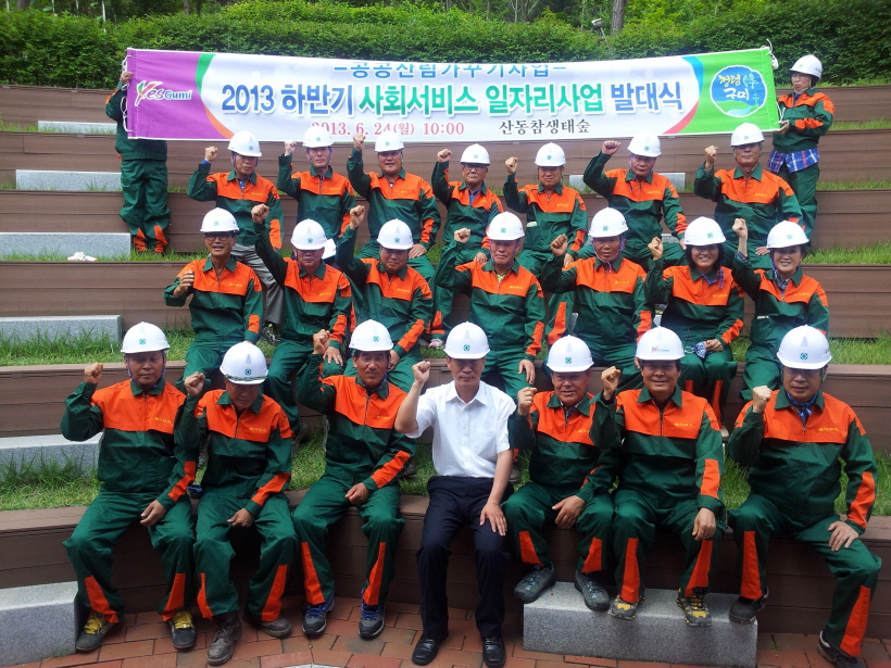 구미시(시장 남유진)는 6월 24일 산동 참생태숲에서 공공근로자 27명이 참석하여 산림분야 녹색 일자리 창출기여 및 가치있는 산림자원 육성을 위한 '2013 하반기 사회서비스 일자리사업 발대식'을 개최했다. 오전에는 교육교재에 의한 근로조건, 작업실시요령등 기본육을 실시하였으며, 오후에는 현장에서 임업기계장비 취급요령 및 각종 안전교육 등을 실시했다. 이번 하반기 사회서비스 일자리사업(공공산림가꾸기)은 6월 24일부터 12월 말까지 실시되며, 작업 내용은 숲가꾸기 사업장에서 생산되는 산림 부산물을 수집 및 정리하는 작업 위주로 실시된다. 안효덕 산림자원계장은 "사업취지 및 방향에 대한 설명과 각종 안전사고 예방을 위한 안전교육 등을 실시하였으며, 또한 산림을 보다 가치있는 산림자원 육성에 최선의 노력을 다하여 줄 것"을 당부했다.