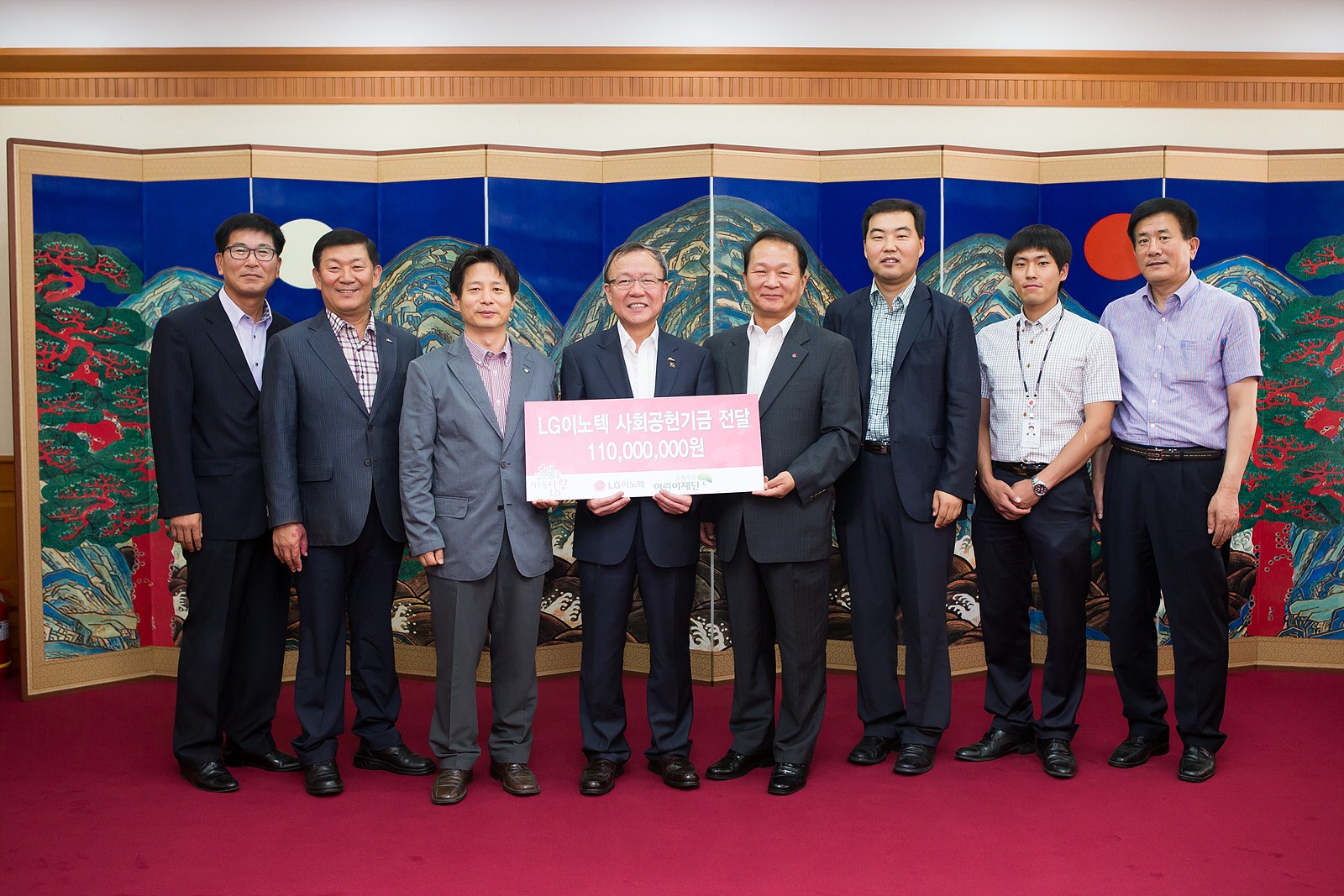 LG이노텍 구미사업장은 6월 25일 구미시를 방문, 관내 저소득 아동들을 위한 후원금 110,000천원을 전달했다. 이번 후원금은 초록우산 어린이재단 경북본부를 통해 관내 지역아동센터 개보수사업에 30,000천원, 조손가정 아동들에 대한 교복 지원사업에 15,000천원, 저소득 아동들과 함께하는 환경정화 활동에 20,000천원, 지산 광평초등학교 결식아동 급식비 지원사업에 15,000천원, 사랑의 김장나누기 사업에 20,000천원, 사랑의 연탄배달사업에 10,000천원 등을 지원할 계획이다. LG이노텍 구미사업장은 구미지역 저소득 세대들을 위해 매년 다양한 사회공헌 활동을 진행해 오고 있으며, 2005년부터 2012년까지 8년간 총 686,008,000원을 구미지역 저소득 세대를 위해 지원해 왔다 이날 행사에는 여상삼 LG이노텍 구미사업장 상무, 김태동 팀장, 권혁철 초록우산 어린이재단 경북본부장이 참석하여 윤정길 부시장과 환담을 나누었다. 여상삼 LG이노텍 구미사업장 상무는 "구미시의 따뜻한 세상 만들기에 동참할 수 있어 기쁘다며, 어려운 이웃들에게 보탬이 되었으면 한다"고 전했다. 윤정길 구미부시장은 "매년 불우한 아동들을 위해 성금 기탁과 지역의 어려운 곳을 찾아 큰 후원과 봉사활동을 펼쳐 주신 것에 대하여 구미시민을 대신하여 감사드린다"며,"앞으로도 구미 시민들의 LG사랑은 영원히 계속될 것이다"고 말했다.