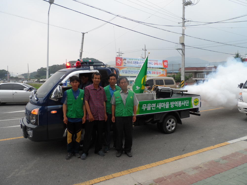 무을면(면장 류시건)은 6월 25일 살기좋은 농촌마을을 조성하기 위해 무을면 새마을방역봉사단 18여명이 참석한 가운데 '2013년 무을면 새마을 자율방역단 발대식'을 개최했다. 이날 발대식은 방역장비 점검, 소독약품 관리 요령 등 각종 안전교육도 함께 실시했으며 주민들이 건강하고 쾌적한 삶을 누릴 수 있도록 방역에 최선을 다할 것을 다짐하고 관내 전 지역을 순회하며 방역활동을 전개했다. 무을면 새마을 방역봉사단은 새마을협의회(회장 김광률) 회원으로 구성되었으며 매년 7월부터 9월까지 지역 주민들의 건강을 위협하는 세균, 유충 등을 구제하여 쾌적한 생활환경을 조성하는 역할을 하고 있다. 류시건 무을면장은 "방역활동에 최선을 다하는 새마을자율방역봉사단이 최선을 다해 방역활동을 하는 것을 보니 믿음이 가고, 방역활동시 안전보호구 착용 및 안전사고 예방에 주의할 것"을 당부했다. |