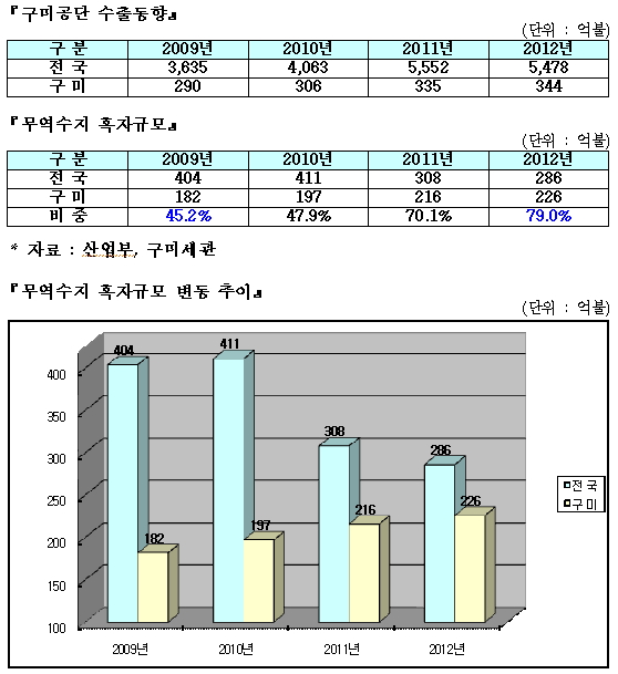 ◈구미공단, 한국경제의 심장이다 2008년 9월 리먼브라더스 파산으로 촉발된 글로벌 경제 침체 이후에도 구미공단은 기업, 근로자 모두 최선을 다해 국가경제의 중심으로 건재하다. 이는 끊임없는 산업구조의 다각화와 다변화를 통해 외부경기에 흔들리지 않는 ‘뿌리깊은’ 경제구조를 만들어 나가고 있기 때문이다. 2012년 344억불 수출을 달성하는 등, 2009년 이후 단 한차례의 수출 감소 없이 연평균 13.5% 이상의 수출 증가세 유지하고 있으며, 무역수지 흑자비중은 해마다 크게 증가하여, 2012년 구미시의 무역수지 흑자규모는 226억불로 대한민국 전체 286억불의 79%를 이루어냈다. 이는 구미시의 산업구조가 ‘적게 수입하고, 많이 수출하는’, 고부가가치「수익 창출형 산업」 위주로 성공적으로 변모하고 있음을 의미한다.