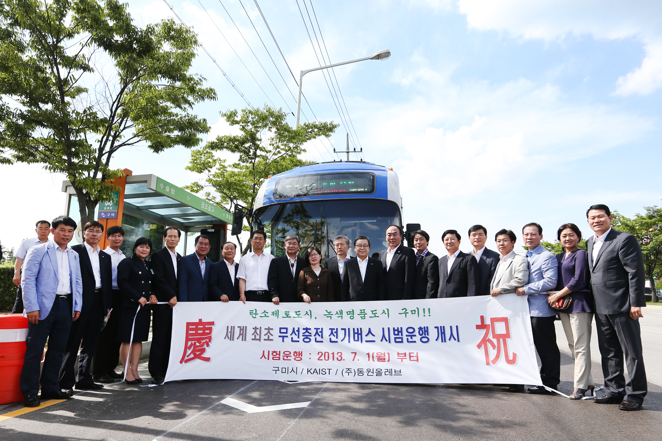 구미시(시장 남유진)는 7월 1일 신평동소재, 급전시설에서 무선충전 전기버스가 세계 최초로 일반도로를 시범운행 하는 축하 기념 행사를 가졌다. 이날 행사에는 첫 운행을 축하하고자 남유진구미시장, 임춘구 구미시의회의장, 황태주 구미교육장등 도.시의원, (주)올레브 대표이사, 녹색어머니연합회, 신평1동 주민등 100여명이 참석했다. 이는 무선충전 전기버스 시범운행 1호 기사인 구미버스 장용수씨에게 축하 꽃다발을 증정하고, 급전시설과 전기버스를 둘러보며 시범사업 관계자로부터 설명을 듣는 시간을 가졌다. 구미시는 금년중 개통행사를 가질 예정이며, 먼저 급진전튜닝, 성능 및 안전성 테스트를 위한 시험운행을 실시하여 안전성을 충분히 검증한 후에 본격 시범운행을 실시하고, 시민에게 시승 기회를 제공할 계획이며 시민시승은 추후 홍보하여 신청을 받을 예정이다.