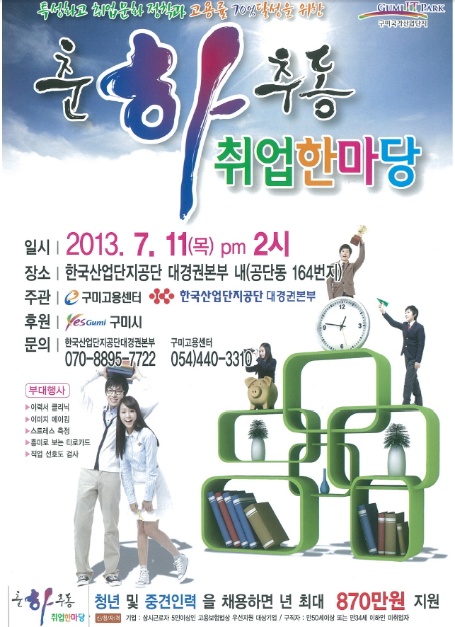 구미고용노동지청(지청장 이기숙)은 특성화고 취업문화 정착과 고용율 70% 달성을 위한 춘하추동 취업한마당 행사를 한국산업단지공단 대경권 본부와 구미시 후원으로 7.11(목) 한국산업단지공단 대경권 본부에서 개최하기로 했다. 이번 행사는 매년 봄, 여름, 가을, 겨울 1년에 4회 행사를 통해 구인·구직자에게 직접 만남의 장을 제공하먀 다양한 취업정보와 기회를 주고 구인업체에는 필요한 인재를 채용할 수 있도록 지원하기 위한 채용지원서비스 행사이다. 이는 춘하추동 취업한마당 두번째 행사로서 구미, 김천 지역의 구인난을 겪고 있는 기업체와 부산, 강원도 등 광역단위 지역의 특성화고 졸업예정자간 일자리와 고졸자를 매칭하는 행사로 진행될 예정이다. 이날 행사에는 (주)루셈 등 25개 업체가 생산직 등으로 200명을 모집하고 증명사진 촬영, 이미지 메이킹 등 다양한 부대행사도 치러질 예정이다. 이기숙 구미고용노동지청장은 "올해 세계경기불황과 엔저현상 등으로 지역의 경기가 안좋은 상황이나 기계금속·전기전자는 그나마 호조를 보이고 있는 상황으로 이들 기업에 대한 인력채용지원이 적극적으로 이루어져야 하는 상황에서 광역단위의 특성화고와 연결하여 채용지원서비스를 제공하는 것은 적절한 대처라고 생각하며 이번 행사를 통해서 앞으로 고졸취업 확대를 위한 산·학·관 협력 취업지원 활동이 정착되기를 바란다"고 말했다. |