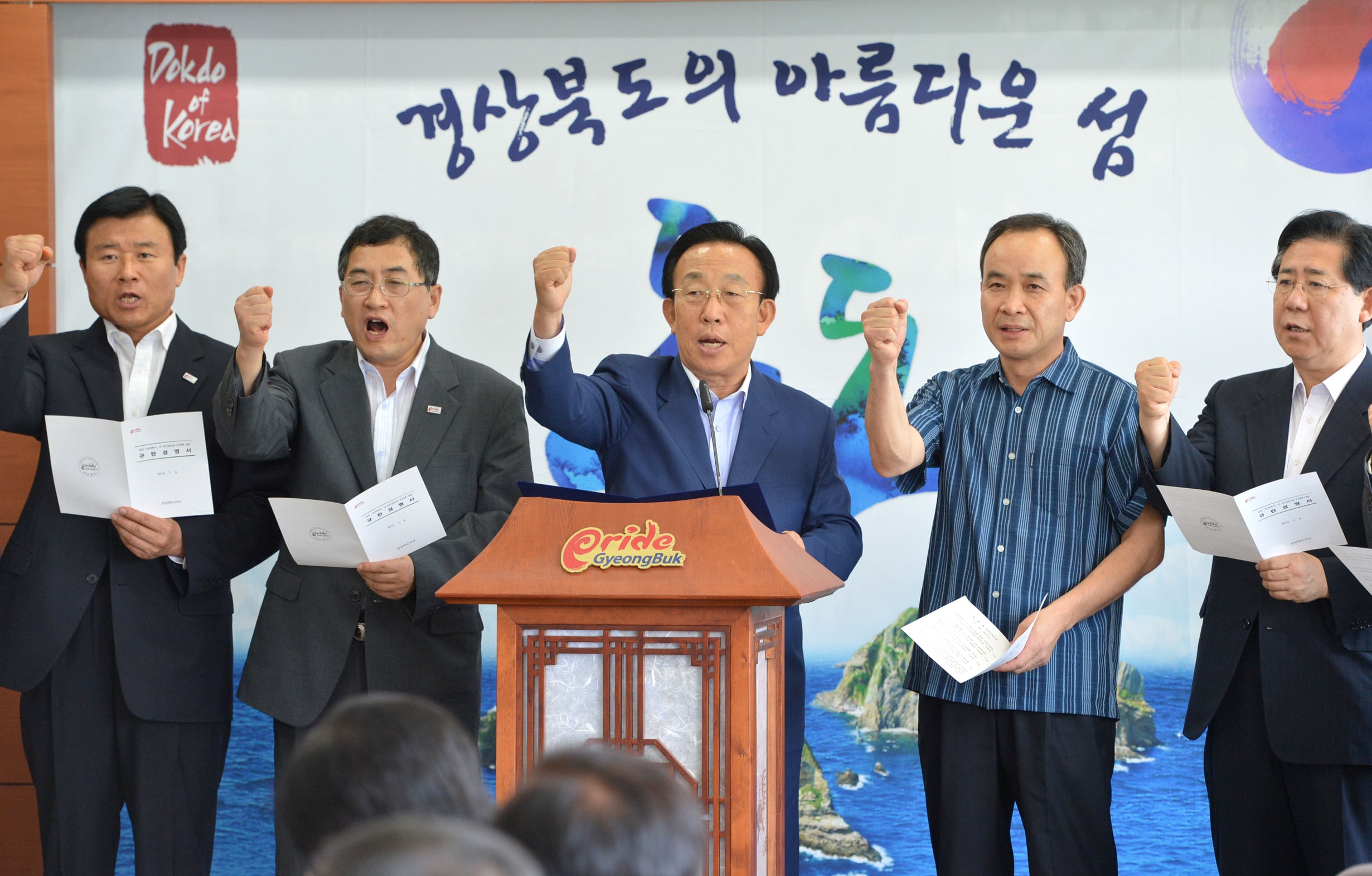 김관용 경상북도지사는 7월 9일 도청 프레스센터에서 긴급 기자회견을 열고 일본 정부가 독도 영유권 주장을 기술한 방위백서를 발표한데 대해 이를 강력 규탄하는 성명서를 발표했다. 김관용 도지사는 성명서에서 일본의 영토 도발은 이미 역사가 단죄한 침략주의의 부활을 획책하는 시대착오적 망동이며, 제2차 세계대전의 전범국으로서 국제사회가 베푼 무한 관용에 대한 배신행위로서 도저히 묵과할 수 없는 사안이라고 강력하게 비난했다. 또한, 일본은 더 이상 무지몽매한 궤변으로 진실을 가릴 수 없다는 사실을 직시하라"며 역사 왜곡과 정치인들의 망언에 대해 경고했다. 영토도발은 인류평화를 위협하는 반인류적·반평화적 행위로서 결코 용납될 수 없으며, 결국 자신들을 해치는 부메랑이 될 뿐이다고 영토도발의 즉각 중단을 촉구했다. 일본의 과거사 인식에 대해서는 과거의 과오를 진지하게 반성하고 개과천선하여 국제사회의 신뢰를 구축하고 상식이 통하는 정상국가로 거듭나야 한다 며 진정한 반성만이 국제사회의 신뢰를 얻는 유일한 방법임을 강조했다. 또, 일본의 영토 도발과 과거사 왜곡은 단순히 주변국과의 문제에 그치지 않고 동북아의 안정과 국제 평화질서를 심각하게 위협하는 것으로서 국제사회가 심각한 우려와 경고를 보내며 주시하고 있다며 더 이상 갈등과 분란을 일으키지 말고 동북아의 안정을 위해 노력할 것을 촉구했다. 아울러, 정부가 추진하고 있는 독도방파제, 독도입도지원센터, 독도종합해양과학기지 등 독도 인프라 구축 사업에 대해서도 독도의 지속가능한 이용을 위해 꼭 필요한 사업이므로 정부가 좀 더 속도감 있게 추진해주기를 바란다"고 언급했다. 경상북도는 독도의 환경 보전과 탐방객의 안전을 충분히 확보하고, 독도에 켜켜이 쌓여있는 역사와 한민족의 정신을 반영한 문화예술 콘텐츠를 발굴하여 세계인들에게 소개하는데 역점을 두고 독도를 문화예술섬으로 만들고 있다"고 말했다. 한편, 일본 방위성은 이날 오전 각료회의를 통해 확정한 2013년 방위백서를 발표했다. 이 책자는 독도에 대해 언급하면서 일본 고유의 영토인 독도 영토문제가 여전히 미해결인 채로 존재하고 있다고 일본 정부의 근거 없는 주장을 기술하고 있다. 일본 방위백서는 1997년부터 매년 독도 문제를 기술하고 있으며, 시마네현이 독도의 날을 제정한 2005년 이후부터 독도는 일본의 고유영토 라는 주장을 계속 하고있다. |