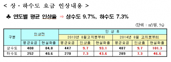 2013년 8월 고지분부터 2년 동안 상수도 19.4%, 하수도 14.6% 인상