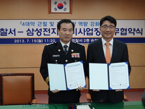 구미경찰서(서장 권오덕)는 7월 15일 구미경찰서 2층 송정마루에서 '삼성전자 구미사업장과 4대악 근절및 지역치안 역량 강화를 위한 업무협약식'을 체결했다. 이번 업무협약을 통해 삼성전자는 임·직원 24명으로 구성된 삼성수호천사라는 자체조직을 구성하여 구미 인동 지역 원룸 및 상가 밀집지역 야간 순찰을 실시 하고있다. 이에 구미경찰서에서는 경찰관을 배치하여 이들의 순찰 업무를 지원하기로 했다. 권오덕 구미경찰서장은 "4대악 척결하여 범죄없는 안전한 도시 구미를 만들겠다"고 말했다.