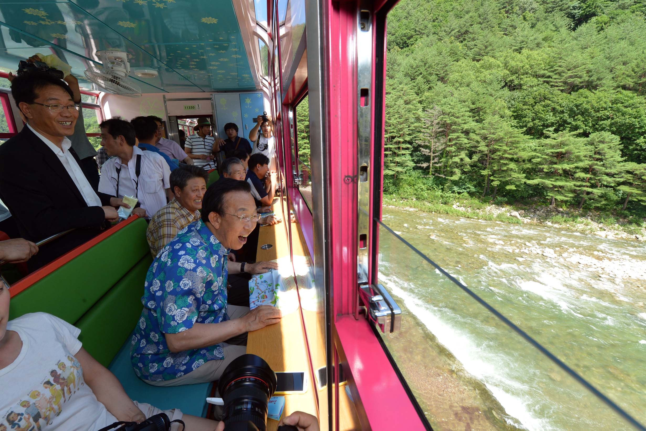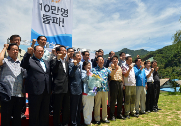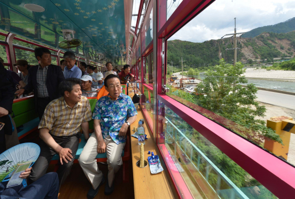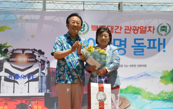 경상북도(도지사 김관용)는 7월 20일 봉화 분천역에서 백두대간 관광열차 이용객 10만명 돌파 기념행사를 개최했다. 백두대간의 기존 철도 인프라를 활용, 생태관광 자원의 색다른 체험과 힐링을 통한 관광객 유치와 도시와 농촌의 특성을 융합한 지역경제 활성화 도모 일환으로 추진해온 이번 행사는10만명 대표 고객에게 꽃다발과 기념품을 증정하고 기념 퍼포먼스, 기관사, 승무원 격려 등 다양한 축하 이벤트를 실시했다. 경상북도와 산림청, 강원도, 충청북도, 코레일 등 정부·지자체·공기업이 함께 손을 잡고 만든 백두대간 관광열차는 접근성이 열악한 백두대간 지역의 관광 활성화를 추진하고 도·농을 연결해 지역 특산물 판로개척으로 농촌경제 활성화를 도모하기 위해 추진해 왔다. 지난 4월 12일 상업운행을 시작으로 매일 평균 1천명의 고객이 열차를 이용, 지금까지 10만명이 이용했으며, 올해 연말까지 25만명에 달할 것으로 전망하고 있다. 백두대간순환열차 V트레인은 백두대간의 아름다운 사계절을 모티브로 제작됐으며 전망석과 커플룸, 패밀리룸, 유아 놀이 공간, 카페 등 총 4량으로 구성되어 있다. 서울역과 수원역에서 출발해 제천, 태백, 영주 등 중앙선, 태백선, 영동선으로 이어진 중부 내륙 순환구간을 1일 4회 운행한다. 특히, 우리나라에서 최초로 가족석과 연인석등 곳곳에 전망 경관 모니터를 설치하여 열차가 철로 위를 달리는 모습을 실시간으로 볼 수 있도록 했다. 백두대간 협곡열차 V트레인은 아기 백호를 모티브로 만들어져 경북 북부 봉화지역의 분천, 양원, 승부역과 강원도 철암역 등 중부 내륙의 절경을 담은 구간을 하루 3회 왕복 운행한다. 지붕에는 태양열 발전판을 설치해 탄소배출을 줄이고 접이식 승강문, 조개탄 난로, 선풍기 등 복고적인 분위기를 그대로 느낄 수 있도록 제작됐다. 특히 천정을 제외한 공간을 유리로 처리해 승객의 관람 시야를 최대한 넓혔으며, 개폐식 창문을 설치해 중부내륙의 상쾌한 공기를 마음껏 느낄 수 있도록 했다. 분천 - 철암간 27.7km를 운행하는 이 열차는 비록 거리는 짧지만 운행시간은 무려 1시간 10분으로 시속 30km의 저속으로 달리는 초저속 열차이다. 빠름이 각광받는 사회에서 협곡열차는 느림을 통해 여유와 풍경을 얻을 수 있어 상대적으로 더 돋보이며 기차를 타는 것만으로도 관광이 될 수 있도록 만들어졌다. 김관용 도지사는 "이번 백두대간 관광열차 운행을 통해 백두대간의 우수한 철도 인프라와 풍부한 관광자원을 연계해 지역의 자생적 발전 역량 확보로 지역경제 활성화 유도의 기반을 마련하는 기회가 될 것임을 확신한다"며, 본격적인 백두대간 열차관광 시대 개막으로 철도기관·단체의 많은 관심과 배려를 당부"했다.