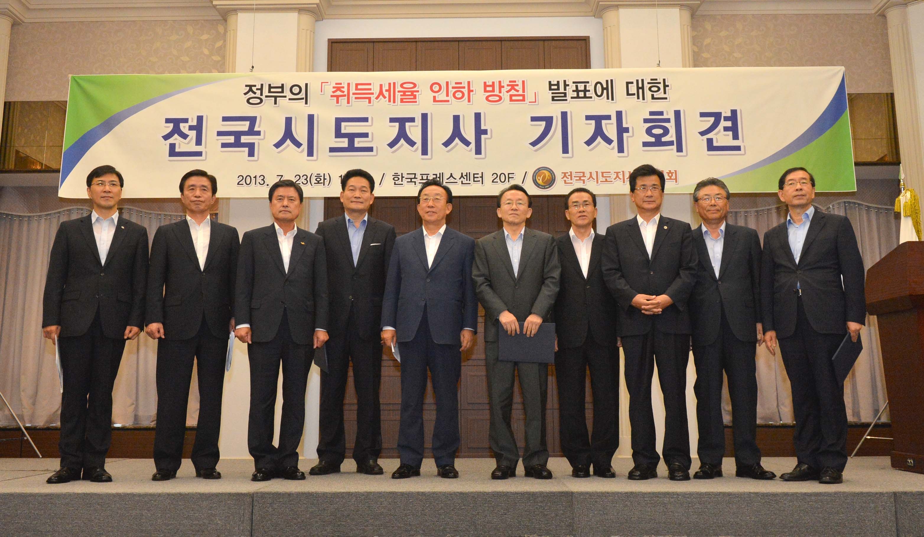 김관용 경상북도지사(전국시·도지사협의회장)는 7월 23일 한국프레스 센터 내셔널프레스 클럽에서 서울시장 등을 비롯한 10개 광역시·도지사가 참석한 가운데 현재 정부에서 진행 중인 취득세 인하에 대해 즉각 중단을 촉구하는 기자회견을 가졌다. 이날 기자회견에서 시·도지사들은 취득세가 시·도세임에도 논의과정에서 조차 배제한 것은 매우 유감스러운 일이며, 취득세율 인하 정책은 부동산거래 활성화 효과가 없을 뿐만 아니라 지방세수를 감소시켜 지방자치의 근간을 흔드는 행위이므로 즉각 중단할 것을 촉구했다. 이날 실시된 기자회견은 지난 7월 9일 공동성명서 발표를 통해 지방세인 취득세가 시·도세의 40%인 점을 감안하여 논의 중단을 기 촉구하였으며, 또한 정부가 다른 대체 수단으로 경기 및 주택거래 활성화를 도모할 수 있음에도 지방의 주세원인 취득세를 가지고 논의한다는 것은 영유아 무상보육처럼 지방에 혼란만 가중시킬 것임을 표명했다. 김관용 경상북도지사는 "취득세율 인하 정책은 부동산 경기 활성화에 영향이 없으며, 오히려 지방정부의 재정적 어려움만 가중시키고 인하 효과도 주택 구입 시기 조정에 그칠 수 있다"고 경고했다. 또한 "부동산 거래 활성화는 국세인 양도세 개편이 효과적이라는 것이 통설임에도 정책효과가 극히 제한적인 취득세를 활용한다는 것은 이해하기가 어렵다"고 지적했다. 한편, 전국시도지사협의회는 이날 취득세 인하 반대 및 현행유지를 위해 앞으로 정부 및 국회를 방문하여 적극 대응할 것임을 천명했다.