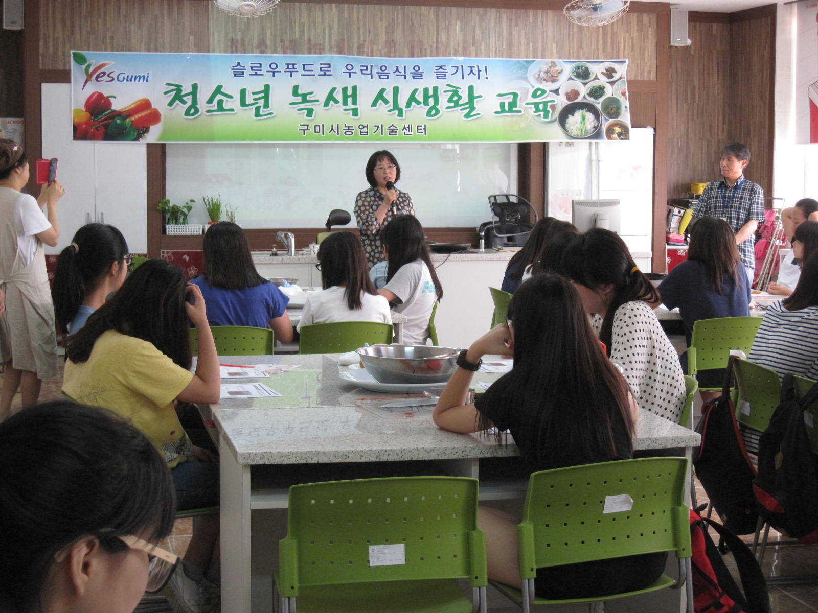 구미시농업기술센터(소장 김영조)는 이번 여름방학을 맞아 평소 패스트푸드로 길들여진 성장기 청소년들을 위해 5개 초·중·고 학교를 대상으로 '청소년녹색식생활 방학프로그램'을 추진한다. 이는 7월 23일 현일중학교를 시작으로 로컬푸드의 개념, 전통 식생활의 우수성, 각종 채소의 성장 과정과 요리법등을 배워보고 찰떡파이와 오미자 화채를 직접 만들어 시식을 하며 우리먹거리, 농업·농촌에 대해 자유롭게 토론하는 시간을 가진다. 또한, 이번 교육은 외부강사를 초빙하지 않고 농업기술센터 담당자를 비롯해 구미지역 전통음식의 계승을 책임지는 우리음식연구회에서 직접 강사로 활동하는 것에 더욱 그 의미가 있다. 김영조 구미시농업기술센터 소장은 "청소년들이 이번 교육을 통해 서구화된 식습관의 문제점을 인식하고 방학기간동안 패스트푸드의 무분별한 섭취를 바로 잡아 청소년들의 식습관의 변화를 가져올 것으로 기대한다"고 말했다.