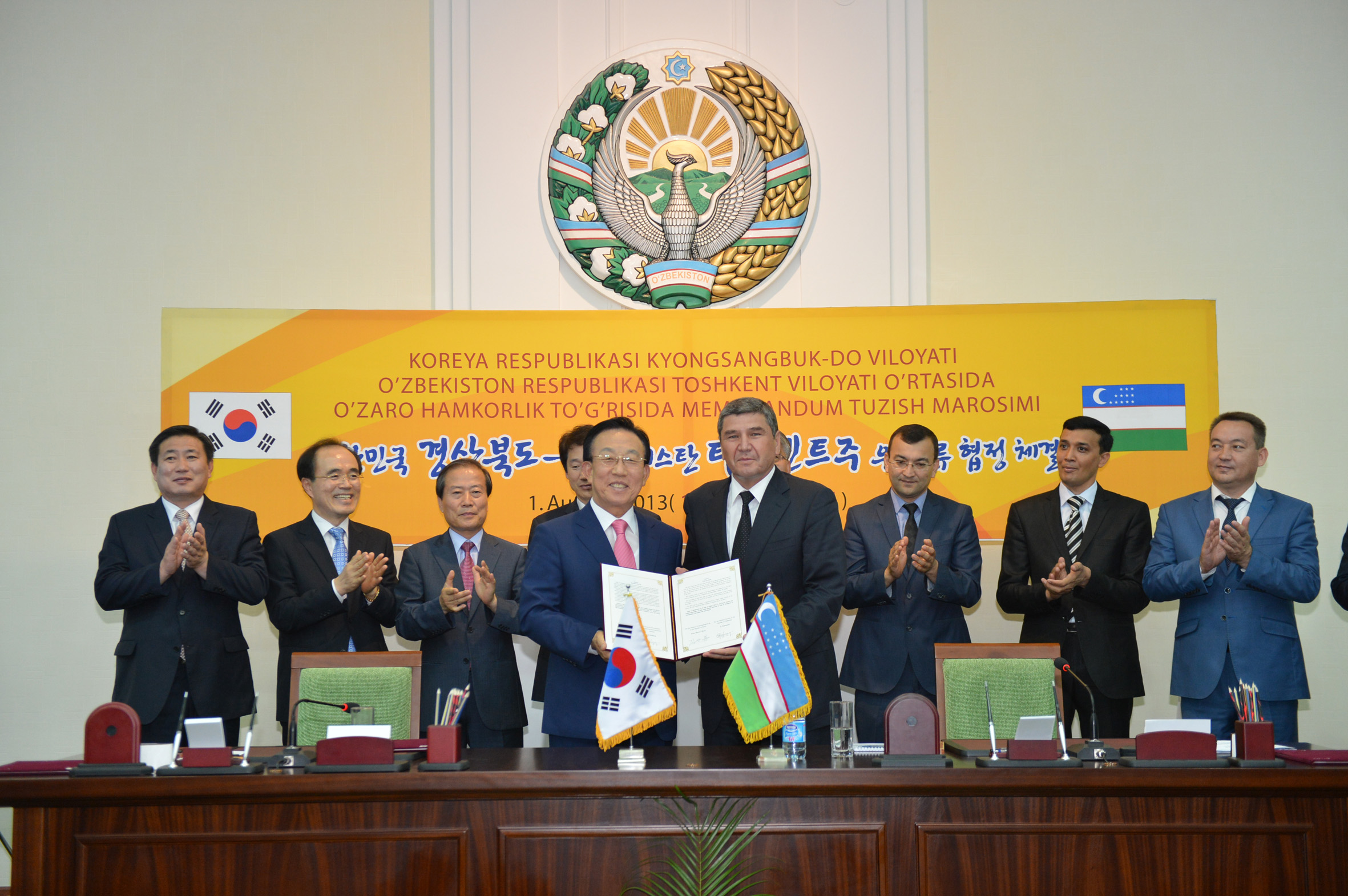경상북도는 8월 1일 중앙아시아 실크로드 중심지역으로서의 역사성과 상징성을 가지고 있는 우즈베키스탄 타슈켄트주와 실크로드 우호교류 협정을 체결했다. 이날 김관용 도지사와 뚜길로비치 타슈켄트주지사는 타슈켄트주정부 청사에서 양 지역의 포괄적인 우호교류 협정서에 공식 서명했다. 한국의 인문교류와 문화융성을 선도하고 민족역사 재조명과 정체성의 부활을 위해 추진하고 있는 코리아 실크로드 프로젝트의 전략적 국제교류협력 사업으로 중국에 이어 중앙아시아 중심인 우즈베키스탄과의 실크로드 협력·상징사업을 통해 한국을 대표하여 중앙아시아 실크로드 우호교류의 새 지평을 열었다. 경상북도-타슈켄트주 우호교류 협정에서는 양 지역의 포괄적인 협력방향과 원칙을 확인하고 경제통상, 개발협력, 새마을운동과 과학, 문화, 스포츠, 교육 등 다양한 분야에서 실질적인 교류확대를 합의했다. 경제통상분야에서 제조업, 무역, 서비스 산업 기업간 파트너쉽 협력 확대와 전시·박람회, 투자유치와 기술교류 협력을 합의 하였으며, 특히, 개발협력분야의 새마을 운동 협력을 명시해 향후 새마을 세계화 차원의 중앙아시아 진출과 확산기반을 마련했다. 이와 함께 과학기술 분야의 공동연구, 기관․대학 협력, 정보 교환 등에 합의했으며, 문화교육 분야에서도 예술전시회, 영화, 관광개발, 문화․스포츠 대표단 교류, 공무원 교환 프로그램 등의 다양한 협력사업들을 구체화 실행해 나가기로 했다. 우즈베키스탄은 타슈켄트를 비롯해 사마르칸트와 부하라, 히바 등 고대 실크로드 중심 거점 지역으로서 역사와 유산을 가지고 있는 중앙아시아 실크로드를 상징하는 대표국가이다. 한반도 2배 면적에 자원이 풍부하고 경제적 잠재력이 높으며 특히, 76년의 이주역사 속에 아직도 한민족의 문화와 정체성을 소중하게 이어가고 있는 민족동포 고려인 17만 여명이 함께 살고 있어 역사·경제뿐만 아니라 정서적으로도 우리나라와아주 가까운 나라이다. 특히, 타슈켄트주는 우즈베키스탄 동북부지역에 위치한 수도 지역이며 카자흐스탄과 투르크메니스탄과 접하고 있는 교통의 요충지로 인구는 270만여명이고 면적은 15만3000㎢이다. 특히, 풍부한 천연자원 철, 구리, 납 등 우즈벡의 스위스라 불리는 침간산을 비롯한 다양한 관광자원을 가지고 있으며 자원, 에너지, 건설, 제조업이 함께 발달된 우즈베키스탄의 12개주 중 최고 중심지역이다. 경상북도는 타슈켄트주와의 이번 우호협정을 계기로 실크로드 프로젝트, 이스탄불 세계문화엑스포와 연계한 중앙아시아 실크로드 거점국가와의 상호교류 협력을 본격 확대해 나가는 한편, 상호 인문교류의 구체화와 문화융성 세계 확산을 선도하고 기틀을 다져나간다는 전략이다. 특히, 경제적 의미와 성과를 동시에 얻는 실리적 경제외교 차원에서 경제통상 협력을 확대하고 금년 하반기 우즈베키스탄을 포함한 중앙아시아 주요국가에 실크로드 무역사절단을 파견하는 등 문화융성의 길 위에 과거 신라인이 개척했던 경제통상의 길을 함께 개척하고 열어나갈 계획이다. 이와 함께, 중앙아시아-독립연합국가(CIS)와의 구체적인 교류사업을 통해 천연자원, 에너지, 문화․관광 등 무궁한 잠재력과 경북도의 새마을운동 등 경제발전과 정체성 찾기 경험과 노하우의 상호 보완관계를 높이고 도내 자원, 에너지, 건설 관련 기업들의 진출과 경제활동 지원도 적극 지원한다는 계획이다. 김관용 경상북도지사는 "실크로드의 주요한 주인공인 우즈베키스탄과의 이번 우호교류의 이러한 의미와 성과 향후 계획을 설명하면서 국가 문화융성과 민족 정체성 찾기의 새로운 모멘텀인 실크로드 프로젝트의 불꽃으로 실크로드의 역사와 번영을 함께 나누고, 과거 신라인이 걸었던 세계 문화 대평원에 새로운 길을 여는 등불로 밝히겠다"고 밝혔다. 한편, 경상북도는 중국에 이은 이번 우즈베키스탄 등의 중앙아시아 국제협력 확대에서 더 나아가 과거 페르시아의 이란을 중심으로 한 중동지역, 이스탄불 중심의 터키지역 등 코리아 실크로드 국제협력 틀을 가시적으로 확대해 나갈 계획이다. 또한 경북 국제화 마스터 플랜수립 등을 통해 이러한 새로운 국제화 전략과 사업들을 반영 구체화 하고 본격 추진해 나간다는 구상이다.