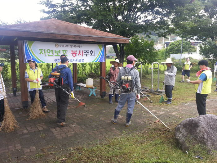 장천면(면장 백인엽)에서는 8월 24일 오전 8시부터 구미 해마루 로타리 클럽(회장 이만기)회원 20여명이 참여한 가운데 장천면 정암공원 등 관내 공원 4군데에 제초작업을 실시했다. 백인엽 장천면장은 “더위가 가시지 않은 무덥고 바쁘신 중에도 해마다 이렇게 지역봉사에 임해주신 회원들에게 감사하다”며, “깨끗하고 쾌적한 장천면이 되도록 앞으로도 적극 동참해줄 것”을 당부했다. 구미 해마루 로타리클럽은 2011년 7월에 발족해 나눔봉사, 자선바자회, 지붕개량사업, 도배, 연탄배달, 성금전달 등 구미시의 소외되고 불우한 이웃들에게 희망과 사랑으로 지역사회 발전에 기여해 오고 있다.
