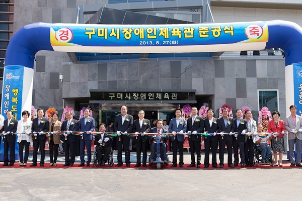 구미시(시장 남유진)에서는 8월 27일 장애인의 복지향상을 위해 건립된 구미시 장애인체육관 준공식을 가졌다. 이날 준공식에는 구미시장, 구미시의회 의장, 도의원 및 시의원, 장애인관련단체장, 장애인, 지역주민, 사회복지공무원 등 500여명이 참석한 가운데 구미시 장애인체육관 준공의 기쁨을 함께 나누었다. 구미시 장애인체육관은 총사업비 105억원을 투자해 2010년부터 2013년까지 만 3년 2개월 동안 추진한 도내 최대규모의 장애인 전용체육관이다. 총 부지면적 19,065㎡, 건축연면적 3,727.39㎡, 지하1/지상2층의 체육관은 다목적경기장, 체력단련실, 프로그램실, 부대 편의시설 등 다양한 시설을 갖추고 있다. 특히, 장애인종합복지관과 연결된 구조로 장애인의 이용 편의성을 극대화시킬 수 있는 one-stop 서비스도 가능할 것으로 보인다. 남유진 구미시장은 “구미시 장애인체육관이 장애가 세상과 소통할 수 있는 화합의 장으로 자리매김 하기를 기원한다”며, “장애라는 불편함을 잊고 사회와 더불어 사는 세상이 될 수 있도록 많은 관심과 배려”를 당부했다. 구미시 장애인체육관이 장애인의 재활과 건강증진을 위한 생활체육 및 재활체육서비스 등 다양한 사회활동 참여의 장소로 활용될 것으로 기대된다.