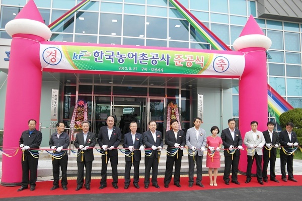 한국농어촌공사 구미·김천지사(지사장 배해직)는 8월 27일 신축 사옥 준공식을 개최했다. 이날 행사에는 배부 한국농어촌공사 부사장, 윤정길 구미부시장, 임춘구 구미시의회의장, 권오덕 구미경찰서장, 윤창욱·변우정·심정규·김봉교·이태식 도의원, 박태환 교육의원, 박세진·김정미·이명희 시의원등 유관기관장들이 참석해 자리를 빛냈다. 지난 1981년에 건립된 건물로 노후화 되고 협소해 직원들의 열악한 근무 환경을 개선하고 지역농업인에게는 양질의 서비스를 제공하기 위해 2012년 06월 26일 착공, 1년 1월간의 공사를 마무리끝에 고아읍 들성리로 이전했다. 신청사는 구미시 고아읍 문성리 문성토지구획지구 6,000㎡에 지하1층 지상4층 철근콘크리트 철골조로 연면적 2,165㎡로 공사비는 49억이 투입 되었으며 태양광을 이용한 전기발전(25KW) 시설과 지열(14공)을 이용한 냉난방시설 설치 등 친환경 신재생에너지 활용형으로 설계시공 되었다. 농업용수 관리 전문 기관의 위상에 맞게 주요 저수지의 저수율을 상시 모니터링해 적기 용수공급 및 집중호우와 장마시에 긴급배수 시설을 원격가동 되도록 물관리종합상황실(TM/TC실)을 설치 운영하게 되어 안정적인 급수 및 재해 예방을 할 수 있는 시스템을 구축했다. 배해직 농어촌공사 구미·김천지사장은 "신청사 이전을 계기로 농업인들에게 보다 질 높은 서비스를 제공하고 지역 농업인과 공사가 더욱 가까워질것을 기대하고 안정적인 물관리를 통해 풍년 영농을 위해 최선의 노력을 다하겠다"고 말했다. 윤정길 부시장은 축사에서 "신축공사 이전으로 효율적인 업무수행 능력을 높여 농업인들에게 살기좋은 농촌이 되고 질 좋은 서비스를 제공할수 있도록 시에서도 적극적인 지원을 아끼지 않겠다"고 말했다. 한편, 농업인들의 활동을 지원하기 위해 농업민사랑방 설치, 대회의실, 주차장, 정원등은 농업인과 시민들에게 개방할 예정이다.