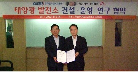 구미전자정보기술원(원장 안병화), (주)영남에너지서비스(대표이사 조성대)는 9월 3일 구미전자정보기술원에서 태양광발전에 관한 연구·운영·건설에 대해 상호 긴밀한 협력체제를 구축하고자 MOU를 체결했다. 구미전자정보기술원은 지역 태양광산업 선도 기관으로 약 300억원 규모의 산업통상자원부 대경권 태양광 테스트베드 구축 사업을 추진해 오는 10월 중순에 구미전자정보기술원 내에 완공되는 태양광테스트베드센터(가칭)를 통해 태양광 부품소재에 대한 시험분석 및 공정지원을 위한 49종의 장비구축을 진행 중에 있다. ㈜영남에너지서비스는 신재생에너지 의무할당제 공급의무사업자인 SK E&S의 자회사로서 태양광 발전소를 운영하는 친환경적 사업을 추진하고 있다. 이러한 상황에 태양광 산업에 대한 산·연간 동반성장 및 시너지 효과를 창출하고자 MOU를 체결하고 태양광 발전 장기 실증 테스트 데이터 베이스 구축, 태양광 테스트베드 인프라를 활용한 셀/모듈 성능, 신뢰성 평가 및 공정지원, 신재생 에너지 공급 의무화에 따른 태양광 발전소 구축에 대해 상호간 협력을 약속했다. 안병화 원장은 "이번 MOU 체결을 통해 태양광 분야 부품·소재 산업 활성화가 기대된다"며, "신재생에너지 산업 확대 및 친환경 도시로 발돋움 할 수 있는 계기가 될 것이다"고 말했다.