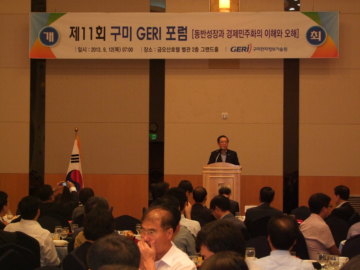 구미전자정보기술원(원장 안병화)은 9월 12일 구미 금오산호텔에서 산ㆍ학ㆍ연ㆍ관 관계자 150여명을 참석해 동반성장 문화 확산의 계기를 마련할 목적으로 제11회 구미GERI 포럼을 개최했다. 이번 포럼은 동반성장과 경제민주화의 이해와 오해라는 주제를 가지고 정부ㆍ대기업ㆍ중소기업의 동반성장과 이를 이루기 위한 경제민주화 방법에 대한 내용으로 동반성장연구소 정운찬 이사장이 강연했다. 정운찬 이사장은 강연에서 "우리나라 경제는 선성장ㆍ후분배의 관성에 젖어 수직적 경제구조 속에서 악순환이 거듭되고 있다"며, 단기적으로는 대기업의 초과이익을 중소기업에게 공유하고 제도적으로는 중소기업의 사업영역을 보호할 수 있는 장치가 필요하며, 중장기적으로는 중소기업 위주의 신산업정책을 펼쳐나가야 한다"고 강조했다. 안병화 원장은 "동반성장이 갖는 본질적인 의미를 파악하고 경제적 불균형 해소를 통한 경제민주화 실현방법에 대해 다양한 의견을 나누는 자리가 되었다"고 말했다. 구미 GERI 포럼은 지역중소기업의 경쟁력 강화를 위해 구미전자정보기술원에서 운영하고 있는 구미지역의 대표적인 지식포럼이다.