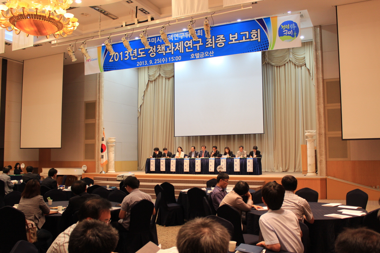 구미시(시장 남유진)는 9월 25일 금오산 호텔에서 정책연구위원, 공무원, 시민등 100여명이 참석한 가운데 구미시 정책연구위원회(위원장 김세웅) 2013년도 정책과제연구 최종 보고회를 개최했다. 이날 행사는 금년 1월~ 3월까지 시민, 연구위원, 공무원등을 대상으로 20건의 과제를 제안받아, 분과 위원회별 심의를 통해 4건의 과제를 선정, 4월부터 연구활동을 시작했다. 지난 8월 28일 연구위원과 관련부서의 의견수렴을 통한 연구내용 보완을 위해 중간 보고회를 가졌고 보완된 내용을 토대로 이 날 최종 보고회를 갖게 되었다. 과제연구 내용을 4개 분과별로 살펴보면, 기획행정분과에서는 도심공동화와 노후화에 따른 대응 및 해결방안에 대해 상권자생역량강화와 이미지향상 전략, 민ㆍ관 파트너십 극대화등 도심활성화를 위해 실행해야 할 과제를 제시했다. 문화복지분과에서는 구미 시민문화예술학교 설립에 관한 정책연구의 과제, 시민문화예술학교 인증제도, 문화예술 네트워킹 강화, 문화예술사관학교 운영 등 시민문화예술학교 기본방향과 추진과제를 구체적으로 제안했다. 또한, 도시환경분과는 안전도시 구미시를 위한 재난관리 시스템 강화방안 연구를 통해 지자체 재난관리 개선을 했고 조기 대응 기반마련과 조직역할 강화와 지역사회 협력 네트워크 강화 방안을 제시했다. 산업경제분과는 전자부품소재 리사이클링 클러스터 조성에 관한 연구를 통해 지역특화 전자부품 고효율 재활용 기술 개발, 산업단지 자원순환 네트워크 구축 등 지역 전자부품소재 리사이클링 산업을 육성할 수 있는 방안에 대해 중점적으로 제안했다. 장용웅 전국상인연합회 구미시지부장은 "상인역량강화를 위한 상권활성화 프로그램 운영, 물리적인 도심재개발과 도시재생 컨텐츠의 조화가 필요하다"고 말했다. 전순한 햇살아동발달지원센터 대표는 "시민의 지역 문화단체 참여 유도로 지역문화단체 활성화와 자발적인 문화학습 분위기 조성을 도모할 것"을 제시했다. 박찬돈 경운대 교수는 "재난복구보다 재난예방이 훨씬 효과적인 환경보전 방법임을 인식하고 재난예방에 초점을 맞춘 정책개발이 필요하다"고 건의했다. 권수근 금오공대 교수는 리사이클링 산업 활성화를 위해 정부와 지자체의 적극적인 제도 개선이 우선시 되어야 한다"고 말했다. 남유진 구미시장은 "구미시정책연구위원회는 2001년부터 운영, 총133건의 과제의 연구가 이루어 졌고, 그 중 117건이 시정에 반영되는 성과를 거두었다"며, "구미시의 부족한 정책연구기능 보완으로 시의 현안과제 해결과 시책개발에 많은 도움이 된다"고 말했다.