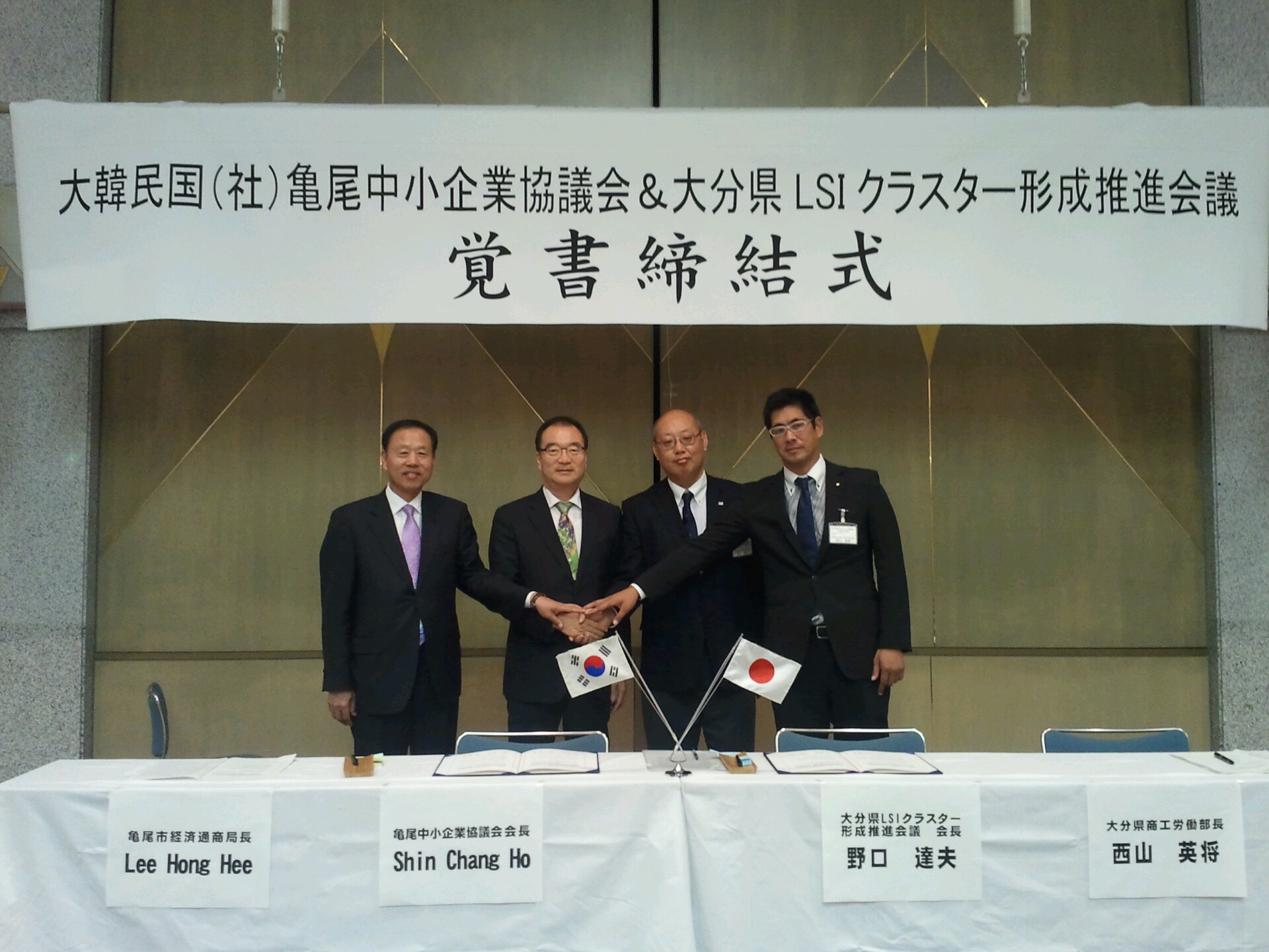 (사)구미중소기업협의회(회장 신창호)는 10월 17일 일본 오이타현에서 협의회 회원사 CEO 21명, 구미시 이홍희 경제통상국장이 참석한 가운데 한ㆍ일 중소기업간 무역, 제품, 산업기술교류증진을 위해 오이타현 LSI클러스터(회장 노구찌 다쯔오)와 양해각서를 체결했다. 오이타현 LSI클러스터는 경제발전과 기업의 경영지원을 위해 2005년에 설립되어 회원사 127개사를 두고 있으며, 연구개발, 공동이익 증진, 경제발전 촉진, 판로개척 및 정보제공, 인재 육성 등 많은 일들을 하고 있는 경제단체이다. 이번 MOU 체결은 2012년 10월, 일본 오이타현 LSI클러스터 이사일행이 구미를 방문한 이후 계획에 의해 1년 뒤 성사된 것이다. 주요내용은 ▲인적자원 교류 및 공동 사업 개발 상호 협력 ▲벤치마킹 정보 등의 교류 촉진 ▲상호 관심 분야의 정부 및 민간 부문 전문가 소개 및 정보 교환 증진 ▲기업체의 생산성 향상과 관련된 정보교류 등이다. 신창호 회장은 “로마는 하루 아침에 이루어지지 않았다는 말처럼 우리가 추구하고 있는 원활한 교류와 협력에는 많은 노력과 시간이 필요할 것이다”며,“이번 MOU체결은 글로벌시대에 상생 발전하는 계기가 되기를 기대한다”고 말했다. (사)구미중소기업협의회는 2011년 8월 남미 콜롬비아 ACOPI와 MOU체결, 2012년 9월 대만 창화현공업회와의 MOU체결, 일본 오이타현 LSI클러스터와의 협약으로 글로벌 네트워크 구축은 물론 국제 경쟁력 강화로 구미경제발전에도 큰 원동력이 될 것으로 기대된다.