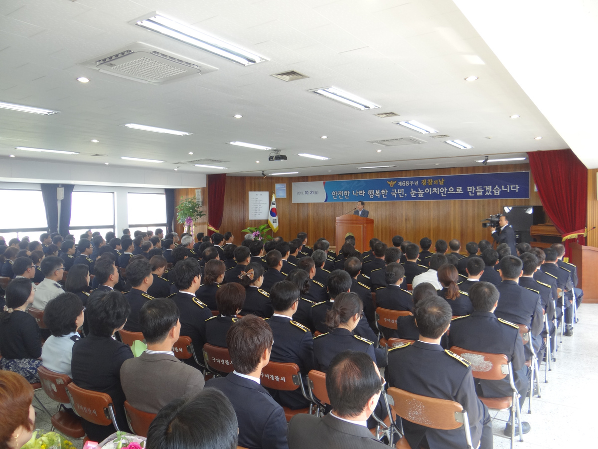 구미경찰서(서장 권오덕)는 10월 21일 경찰서 4층 대회의실에서 '제 68주년 경찰의 날' 행사를 개최했다. 이날 행사에는 남유진 구미시장 및 협력단체장, 경찰관, 일반인등 160명이 참석했다. 남유진 구미시장, 김재수 경우회장은 구미시의 치안 안정을 위해 최선을 다하고 있는 경찰관들을 격려하고 표창 및 감사장을 수여했다. 경찰의 날 유공자 포상으로는 권용락 형사과 대통령 표창, 정진용 수사과 경감 행정안전부 장관 표창, 권형대 도량지구대 경장, 경찰청장 표창등 유공자 80여명에 대해 표창을 수여했다. 또, 경찰 협력단체 및 경찰발전에 기여한 유공이 있는 일반인 20여명에 대해서는 감사장을 전달했다. 권오덕 구미경찰서장은 "이번 경찰의 날 행사를 계기로 더욱 더 구미시의 안정된 치안을 위해 최선을 다하겠다"고 말했다.