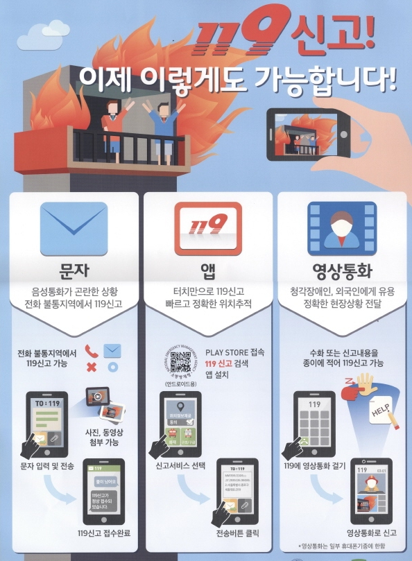 구미소방서(서장 이구백)는 스마트폰시대에 발맞추어 신고자들의 119신고 편의를 위한 ‘119다매체 신고 서비스’ 에 대한 적극적인 홍보에 나섰다. 다매체 신고서비스는 스마트폰 보급이 확산되면서 통신환경의 변화에 부응하고 신고권을 보장하는 차원에서 영상, 문자, 앱 등의 방식으로 119신고를 할 수 있는 서비스다. 소방방재청에서 제작한 앱을 이용한 신고방법은 플레이 스토어에서 119신고 앱을 다운받아 긴급 상황 발생시 활용할 수 있고 문자신고는 음성통화가 곤란한 상황이나 음성통화 불통 지역에서 119신고가 가능하다. 영상 신고서비스는 일부 기종에 한해서 시범운영 중에 있고 향후 모든 스마트폰에서 영상 신고가 가능토록 오는 2015년까지 지속적으로 사업이 추진된다. 이구백 소방서장은 "119 신고 앱 서비스는 터치만으로 신고가 가능하고 정확한 위치가 제공된다"며, "장애인, 외국인, 및 음성신고가 어려운 취약계층에 대한 119신고 편의성 향상과 신속한 119서비스 제공에 도움이 될 것으로 기대된다"고 말했다. |
