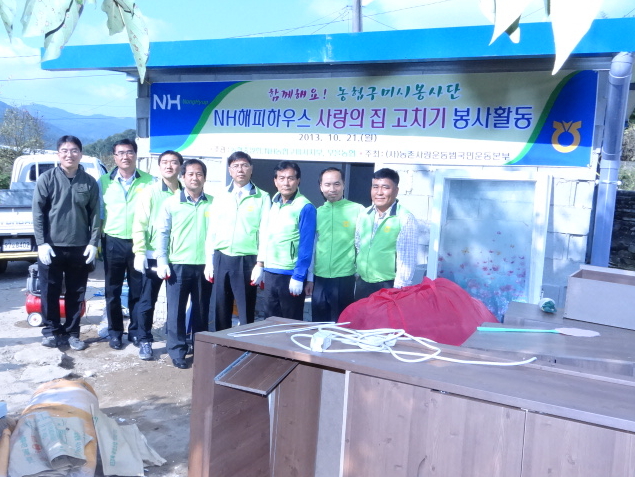NH농협구미시지부(지부장 김기해)는 10월 21일 직원들과 함께 무을면 송삼리 김수곤 농가를 방문해 NH해피하우스 농촌주거환경 개선사업을 실시했다. 이번 사업은 (사)농촌사랑범국민운동 본부로부터 후원받아 취약계층 농업인이들의 주거환경 개선과 쾌적한 주거환경을 조성하고 가구당 오백만원씩 지원하고 있으며 경북관내 10가구가 선정되어 농촌지역 활력화를 도모하기 위해 추진 중에 있다. 이번 'NH해피하우스' 사업으로 주택 수리 지원을 받은 농가(무을면 송삼리)는 '농협의 도움으로 좁고 불편했던 생활공간이 위생적으로도 깨끗하고 편리하게 개선되어 감사하다"며 농협 관계자 들에게 고마움을 전했다