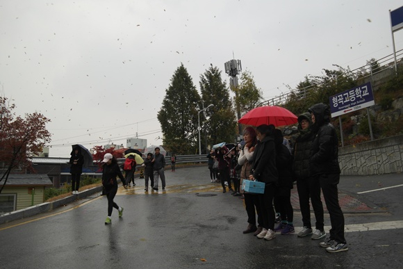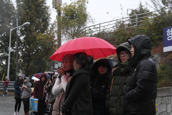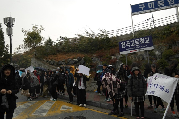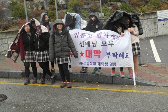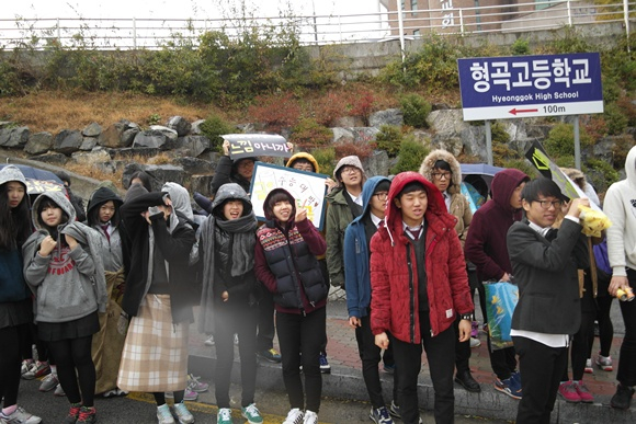 입동인 11월 7일 수능 당일날. 형곡고등학교앞에는 갑자기 내리는 비에도 아랑곳하지 않고 후배들의 응원은 뜨겁기만 하다.