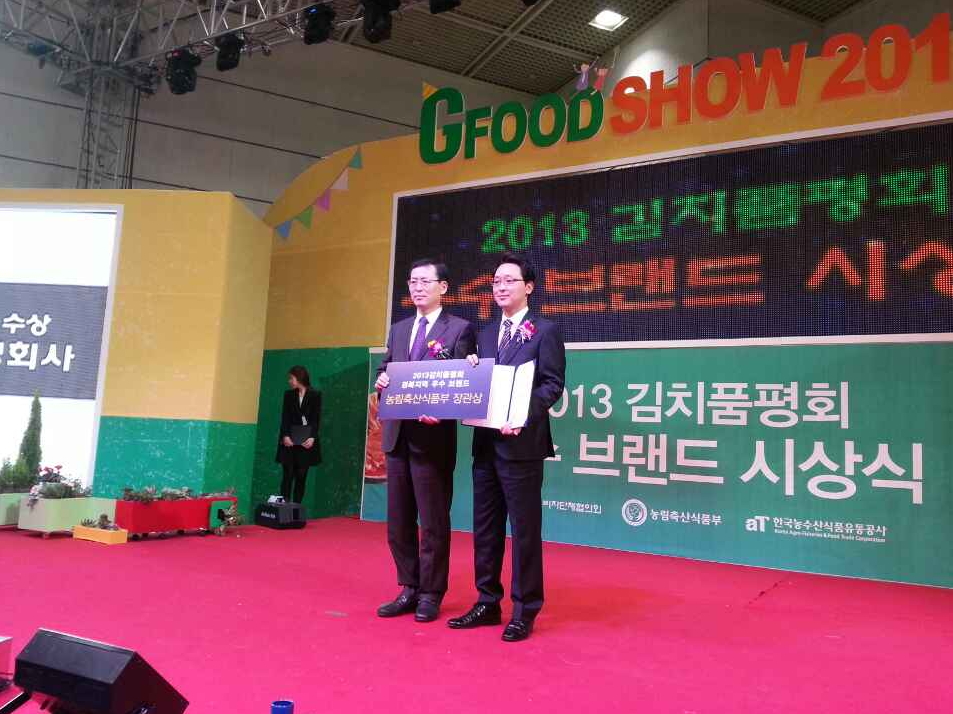 구미시(시장 남유진)는 11월 8일 서울 코엑스에서 개최된 2013년 김치평품회에서 구미협동식품(대표 문동환) 별미김치가 경북권 최우수 김치 브랜드로 선정되어 농림축산식품부장관 표창을 받았다.
