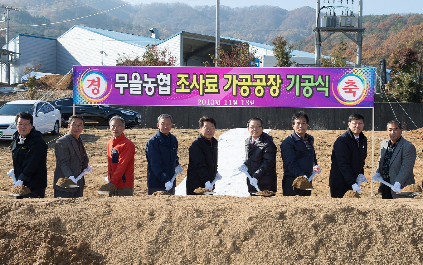 무을농협(조합장 김연목)은 11월 13일 무을면 원리 833번지 일원에서 남유진 구미시장과 김기해 농협중앙회구미시지부장을 비롯한 무을농협 이사 ㆍ감사 등 30여 명이 참석한 가운데 '조사료 가공시설 기공식' 행사를 가졌다.