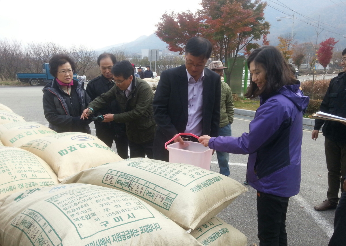 인동동(동장 김종율)은 11월 14일 신동 마을회관 및 천생산 석굴 앞 2개소에서 도ㆍ시의원, 지역 농민, 검사관, 농협 직원 등 60여 명이 참석한 가운데 2013년산 공공 비축미곡 포대벼 2,296포(총 91,840kg)에 대한 매입을 실시했다.