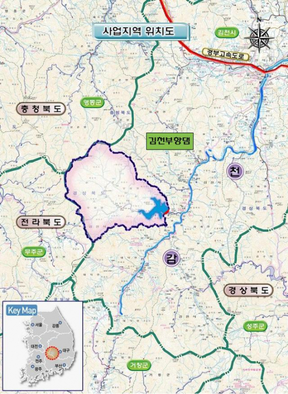 김천부항다목적댐 건설사업은 김천시를 관통하는 감천 유역의 홍수만에 사업비 5,559억 원을 투입해 완공한 총저수량 5,430만㎥, 홍수조절 능력 1,230만㎥을 가진 대형 국책사업이다.