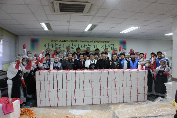 겨울철 저소득 가정의 따뜻한 겨울맞이를 위해 아사히글라스 3개 계열사 아사히초자화인테크노한국ㆍ아사히피디글라스한국ㆍ한국테크노글라스와 협력, 임직원 40명과 구미종합사회복지관 노인대학 회원 10명이 함께 참여해 1,000포기에 달하는 김장김치를 정성껏 만들어 지역 내 요보호 300세대에 배달했다.