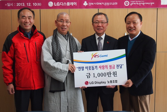 같은 날 LG Display(주) 노동조합(위원장 석호진)은 연말 이웃 돕기 성금으로 일천만 원을 전달해 이웃사랑을 실천하는 모범 사례가 되고 있다.