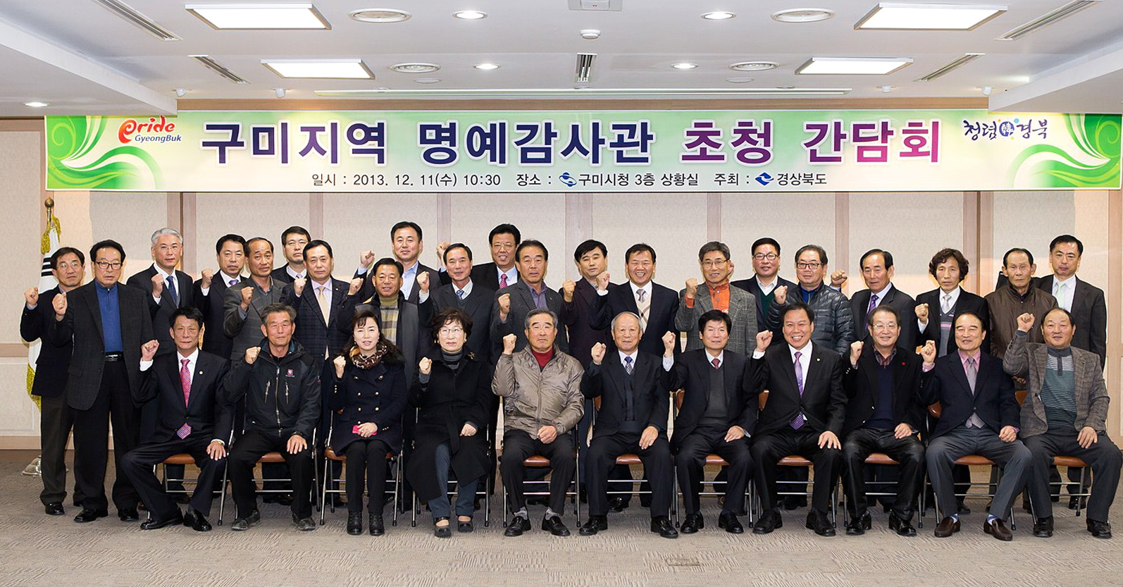 구미시(시장 남유진)는 12월 11일 구미시청 상황실에서 경상북도 명예감사관 37명과 전상배 경상북도 감사관, 박재수 경상북도 감사자문관, 구미 지역 도 명예감사관 등이 참석한 가운데 행정의 신뢰성 제고 및 도ㆍ시정에 대한 참여 기회 확대를 위한 간담회를 개최했다.