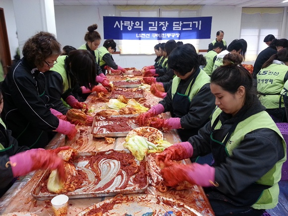 구미종합사회복지관(관장 이병훈) ㆍLS전선은 겨울철 저소득 가정의 따뜻한 겨울맞이를 위해 12월 11일 구미종합사회복지관 별관 2층 강당에서 '김장나누기 행사'를 개최했다. 이날 행사는 LS전선 참사랑 회원 50명이 참여해 600포기 김장김치를 정성껏 만들어 지역 내 요보호 150세대에 배달했다. LS전선 참 사랑회(회장 남상주)는 1999년 창단 이후 2004년부터 현재까지 구미종합사회복지관과 연계해 지역 내 무의탁 노인 및 저소득 가구에 결식예방을 도모하고 지역주민들의 변화하는 욕구에 능동적으로 대처하며, 사회복지 발전과 이웃사랑을 몸소 실천하고 훈훈한 정을 나눠 모범사례가 되고 있다.