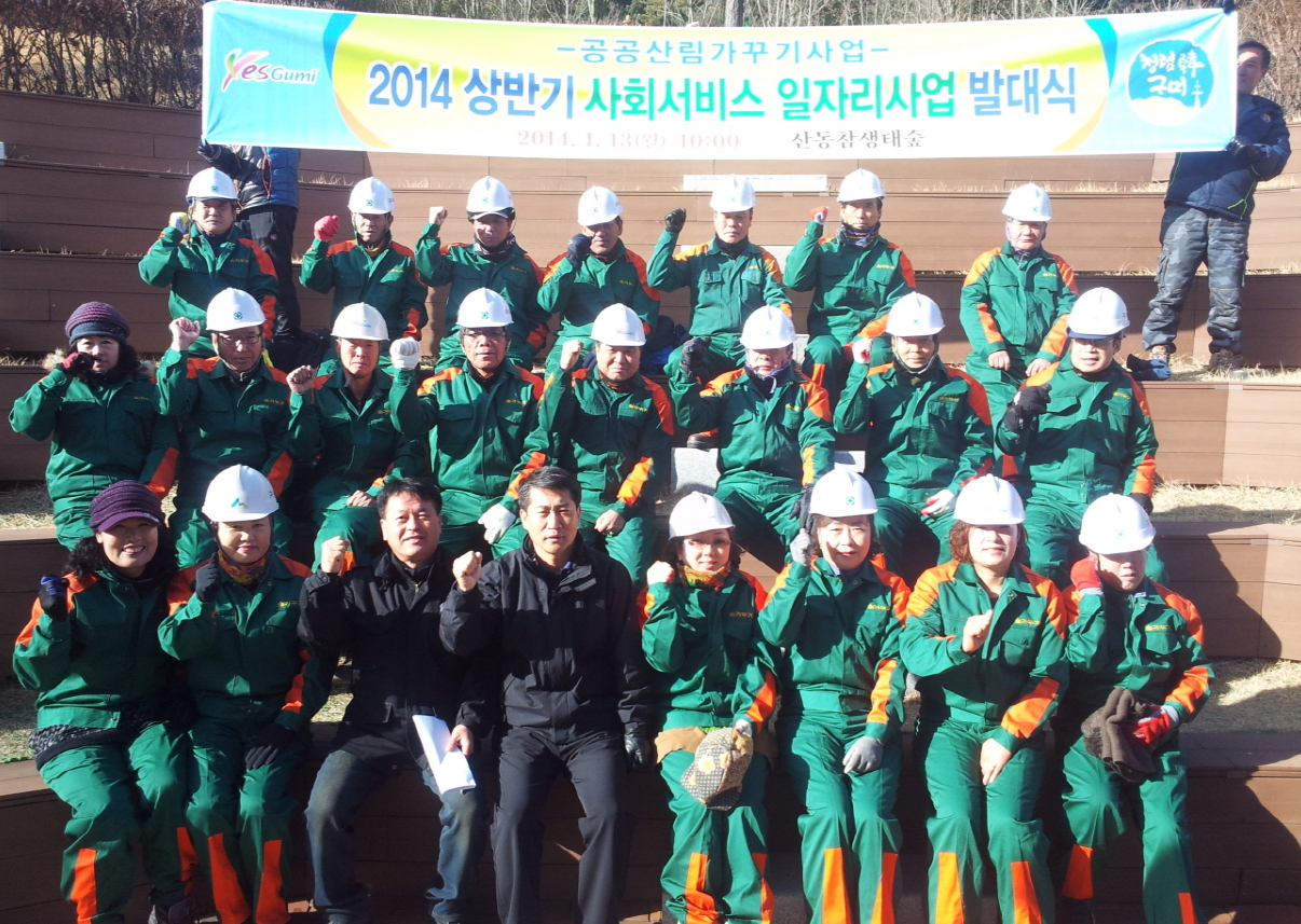 구미시(시장 남유진)는 1월 3일 산림분야 녹색 일자리 창출 기여 및 가치 있는 산림자원 육성을 위한 '2014 상반기 사회서비스 일자리 사업(공공산림 가꾸기)' 발대식을 공공 근로자 27명이 참석한 가운데 산동 참 생태숲에서 개최되었다.