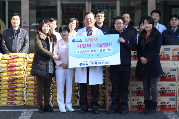 구미 차병원은 매년 신정 세밑에는 어려운 이웃과 독거노인 세대에 구정 세밑에는 소년ㆍ소녀가장 세대와 조손가정에 동절기 생필품을 전달하며 훈훈한 정을 나누고 있다.