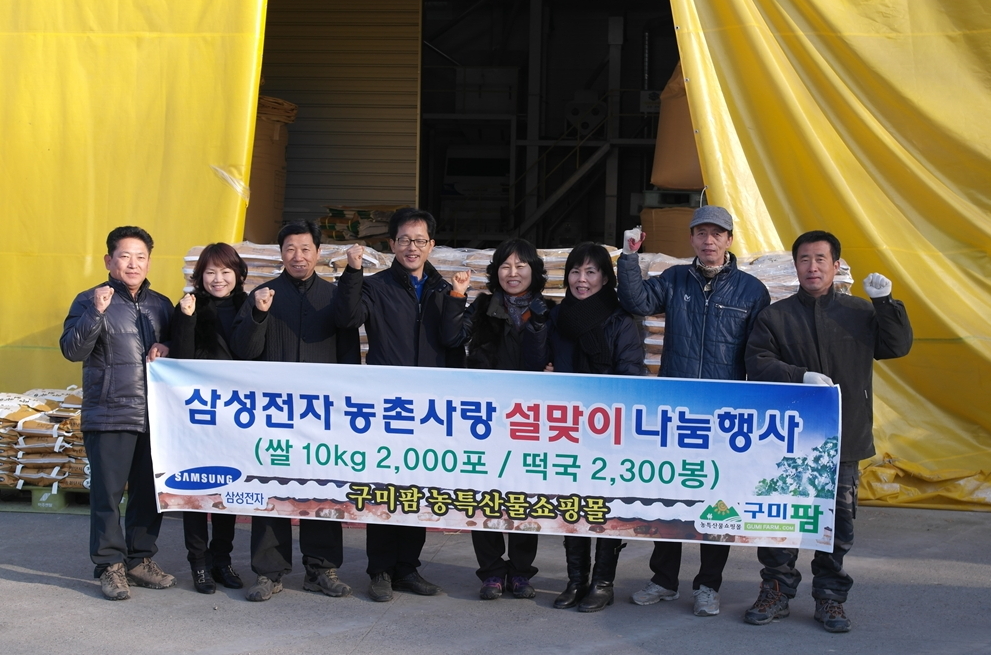 농업인의 직거래 쇼핑몰인 '구미팜'이 명절을 맞아 쌀 10kg들이 2천 포대와 떡국 2kg 2,300봉지 등 4,000만 원상당을 삼성전자 구미사업장 (공장장 전우헌)에 납품하는 쾌거를 올렸다.