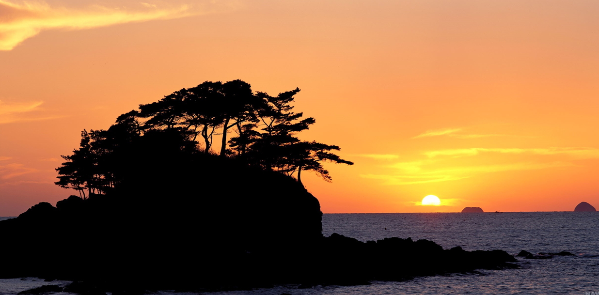 해질 무렵, 바다를 둘러싼 산들이 마치 단풍이