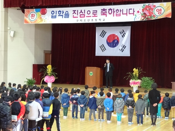 구미오산초등학교(교장 정재민)는 지난 3일 10시 본교 강당에서 교직원과 6학년 재학생, 신입생, 학부모가 참석한 가운데 '제9회 입학식'을 개최했다.