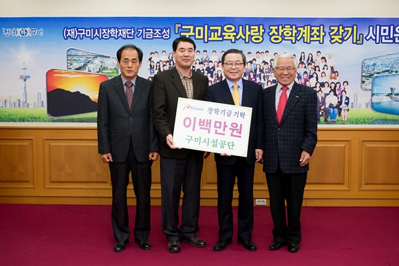 구미시장학기금 일천억 원 목표에 십시일반으로 적극동참 ▲구미시설공단(이사장 이춘배) 200만 원, ▲교육원 수강생일동(대표 송태수, 신광옥) 100만 원, ▲상모사곡동 7개단체(통장협의회, 새마을협의회, 새마을부녀회, 바르게살기위원회, 자연보호협의회, 체육회, 청소년지도위원회) 100만 원, ▲구미시청불자회(회장 유영명) 100만 원, ▲복되고 돈되고(대표 지태만) 100만 원, ▲구미시청산악회(회장 김종원)에서 70만 원을 각각 기탁했다.