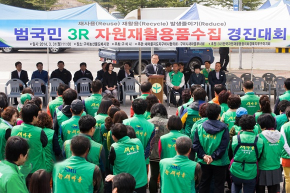 구미시새마을회(회장 김봉재)는 3월 31일 11시부터 구미시농산물도매시장에서 읍ㆍ면ㆍ동 새마을남여지도자 300여 명이 참여한 가운데 저탄소 녹색생활화 운동의 일환으로 '2014년 재활용품 수집 경진대회'를 개최했다.