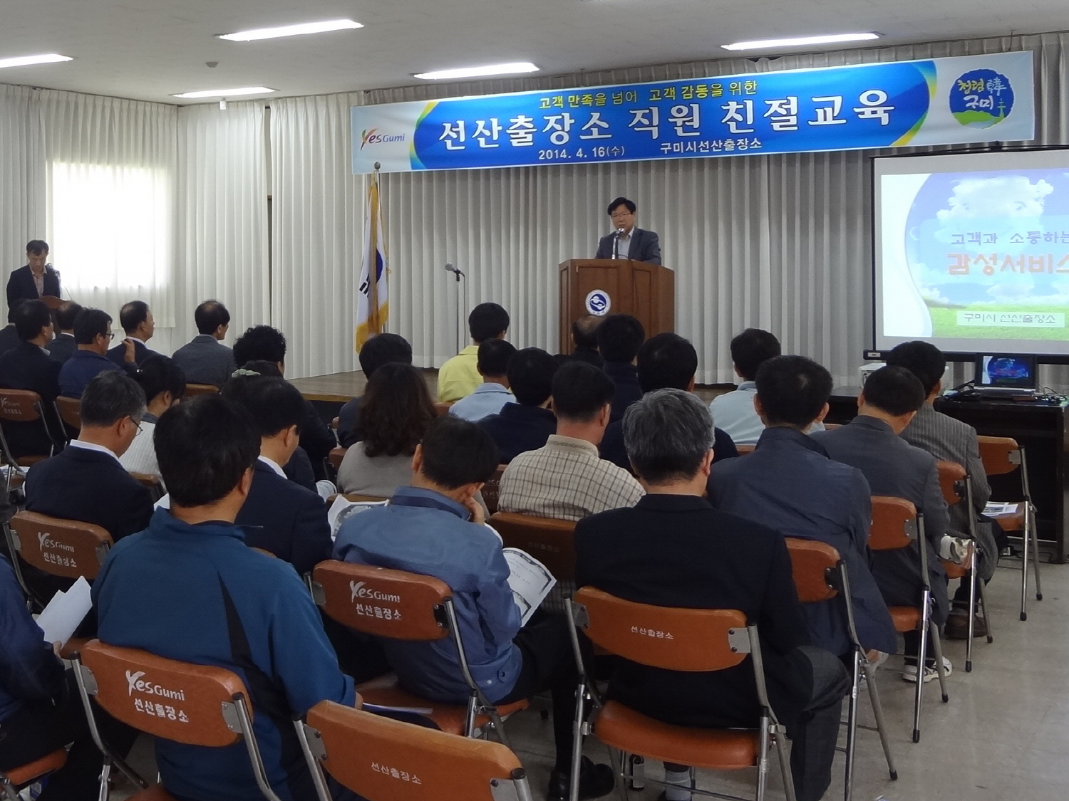 구미시 선산출장소(소장 황필섭)는 4월 16일 출장소 직원과 농산물도매시장 관리사무소 직원 70명을 대상으로 고객과 소통하는 감성서비스를 주제로 하는 고객만족 친절 교육을 실시했다.