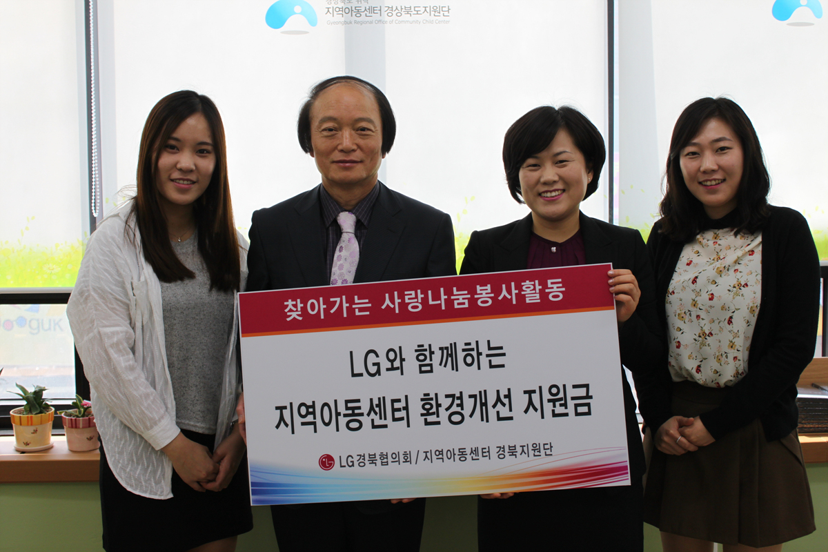 LG경북협의회(회장 이웅범)는 4월17일 자립도가 낮은 지역 내 지역아동센터 3곳(고아읍 다평지역아동센터ㆍ인동동 소망지역아동센터ㆍ인동동 열린지역아동센터)을 선정해 지역아동센터 경북지원단과 함께 '찾아가는 사랑나눔활동-지역아동센터 환경개선 지원금 전달식'을 가졌다.