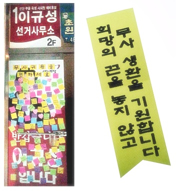 특히, 타 후보는 검은 리본과 검은색 옷을 입고 선거운동을 하는데 반해 이 후보는 희망과 기적의 염원을 담아 노랑색 리본과 선거사무소 입구에 무사생환을 기원하는 메세지를 전하는 포스트잇으로 감동을 전하고 있다.