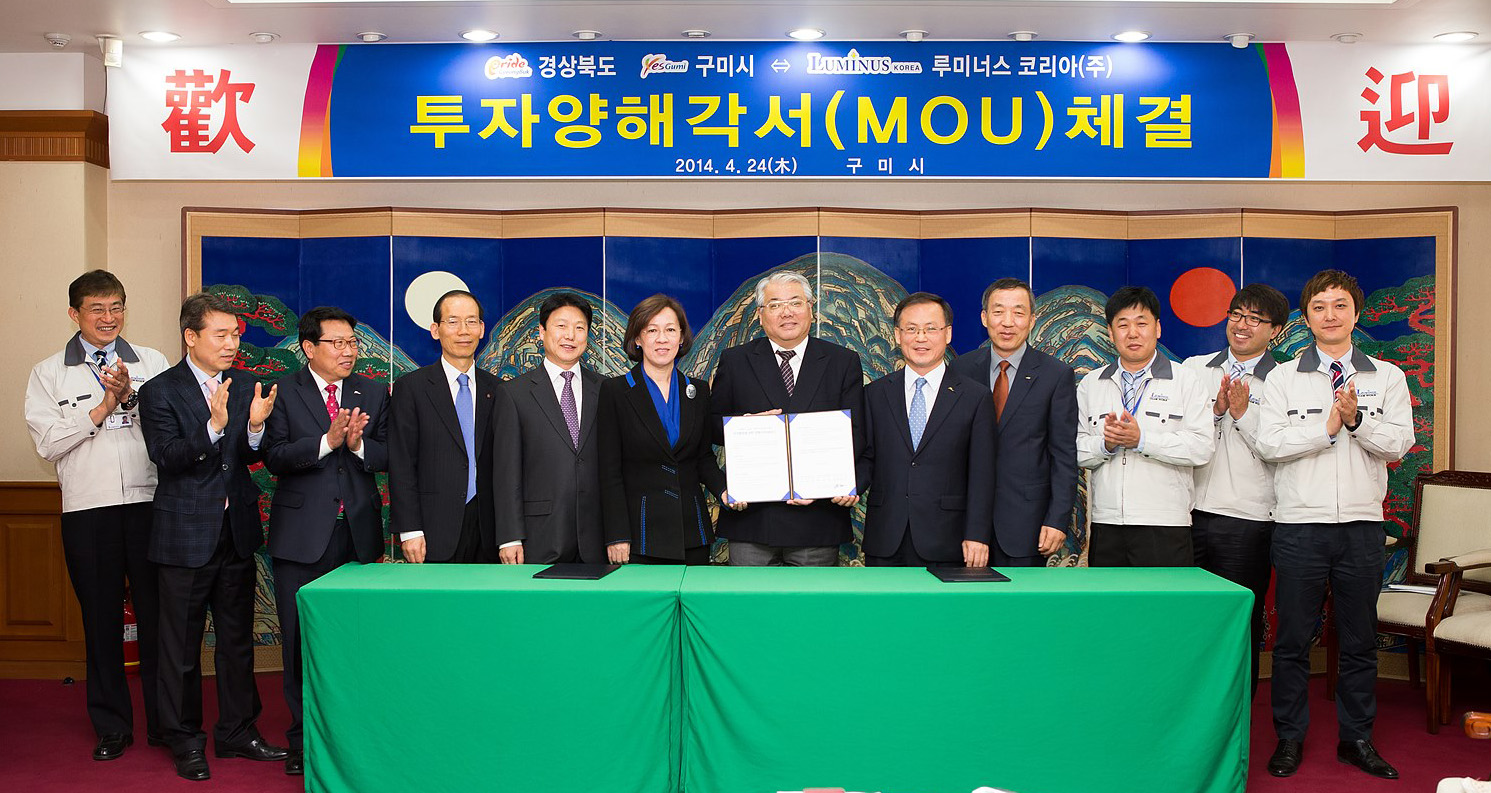 구미시는 4월 24일 시청 국제통상협력실에서 구미시장 권한대행 최종원 부시장, 이인선 경상북도 정무부지사, 에구치 요(江口 洋) 사장이 참석한 가운데, 루미너스코리아(주)의 자동차 램프부품 생산 공장건설과 관련한 '경상북도 구미시↔루미너스코리아 투자양해각서(MOU)'를 체결했다.