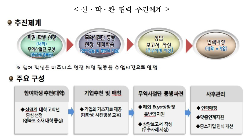 사업 참여시 중진공 및 지자체는 전체적인 사업 기획 및 예산확보, 통상전문인력 및 참여기업간 매칭을 지원, 대학은 외국어 및 무역지식을 갖춘 학생 선발과 비용 보조, 기업은 바이어와의 현장 상담 및 파견전 국내 기업에서 실습기회를 제공하게 된다.