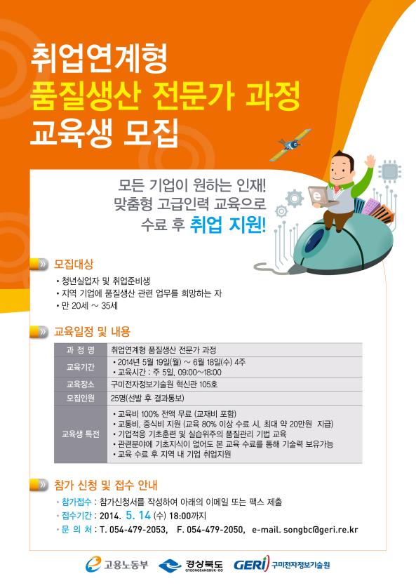 구미전자정보기술원(GERI, 원장 안병화)은 2014년 지역맞춤형 일자리창출 지원사업의 일환으로 품질생산 전문가 과정을 5월 19일 ~ 6월 18일까지 개설한다.