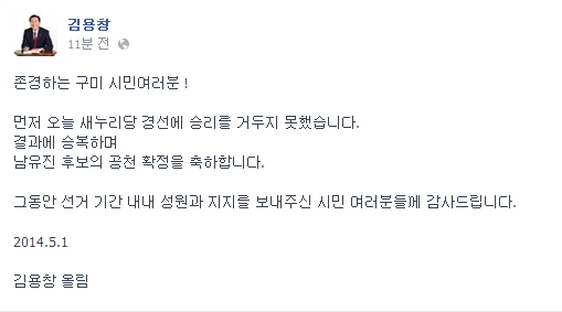 김용창 예비후보가 5월 1일 새누리당 경선 결과를 받아들인다고 페이스 북을 통해 알렸다.