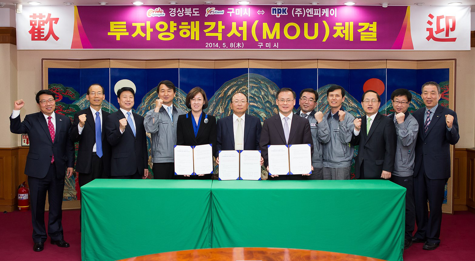 구미시는 5월 8일 시청 국제통상협력실에서 구미시장권한대행 최종원 부시장, 이인선 경상북도 정무부지사, 최상건 (주)NPK 회장이 참석한 가운데 (주)NPK의 플라스틱 컴파운드 생산 공장건설과 관련한 경상북도ㆍ구미시 ↔ 엔피케이 투자양해각서(MOU)를 체결했다. 이는 지난 달, 루미너스코리아의 MOU체결 이후 자동차 소재산업 투자이어서 관심이 집중되고 있다.