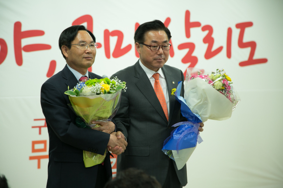 특별히 이날 개소식에는 같은 무소속 후보로 출마한 이재웅 후보가 참석해 서로 축하와 감사를 나누며 꽃다발을 전달했다.